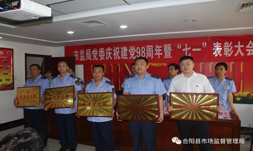 为纪念中国共产党成立98周年,回顾党的光辉历程,牢记党的丰功伟绩,充分发挥党员干部先进典型示范作用,6月28日下午,中共合阳县市场监督管理局委员会召开了纪念中国共产党成立98周年暨“七一”表彰大会。全体党委委员、基层党支部书记、优秀党员代表等共计70余人参加会议。
