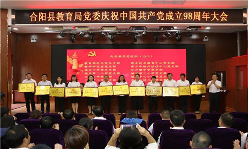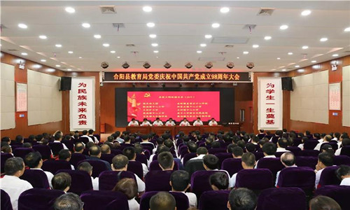 6月27日下午,合阳县教育局党委庆祝中国共产党成立98周年大会在城关中学会议厅隆重举行。教育局党委委员、机关股室负责人,各党(总)支部书记、组织委员,各校(园)长、直属单位负责人、受表彰优秀共产党员、新接收预备党员共300余人参加了会议。会议由教育局党委副书记宁丽君同志主持。