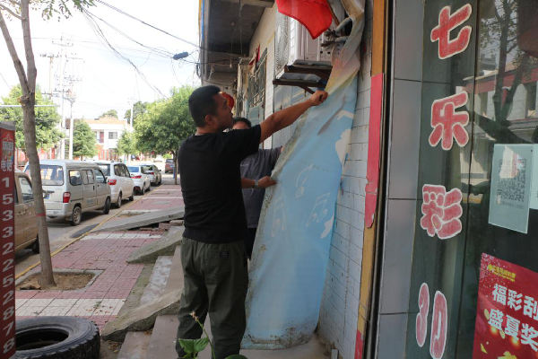 清除散乱广告:一方面组织镇街志愿者、发动沿街商户,对电线杆、地面、墙面、门面上的各种广告进行地毯式排查清理,另一方面强化商户教育,一是自身不乱帖宣传广告,二是积极阻止他人乱贴宣传广告,并劝导商户不出店经营,强力营造“文明有我 我即文明”的主人翁意识。