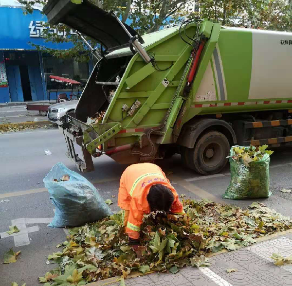 对于人工清扫后堆放的落叶,环卫中心每天出动10余辆拉运车,对袋装收集后的落叶进行集中清运,缩短落叶收运时间,有效地提高工作效率和保洁质量。