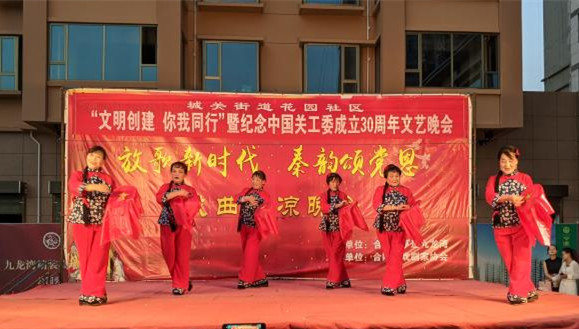 9月6日晚,合阳县九龙湾广场歌声嘹亮,舞姿翩跹。为进一步推进全国文明城市创建工作,掀起新一轮创建热潮,由城关街道花园社区举办的“文明创建 你我同行暨纪念中国关工委成立30周年文艺晚会”在广场精彩上演,晚会吸引了众多观众驻足观看。在晚会现场,社区还摆放了创文、核心价值观、文明礼仪等宣传展板,并向群众派发宣传彩页,营造了良好的创文宣传氛围。