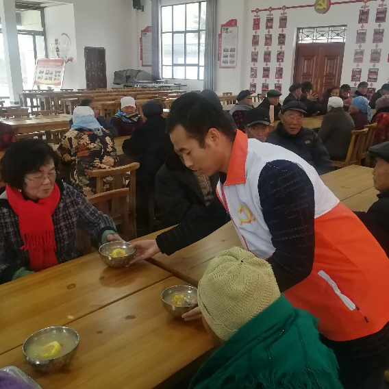 志愿者引导参加仪式的老人按次序就座,为老人们提供热水,提供方便,中午时间为困难老人准备食餐。志愿队分三组,摆放桌椅,帮厨,擦桌端饭“店小二”,为50多位老人端去可口的饭菜。仪式结束后,刘天益老人走出会场,转身笑着对身穿马甲的志愿者说:“你们这些年轻娃娃们,辛苦了,是党和政府的好干部”。即使天寒地冻,“五色花”志愿者的行动暖了老人的胃,更暖了群众的心。