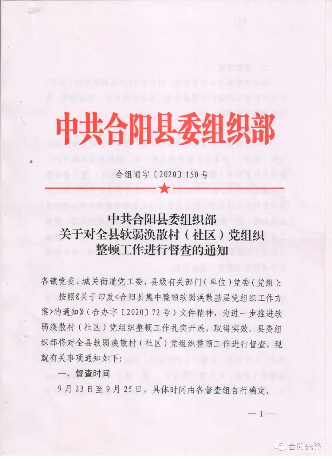 为深入推进全县软弱涣散村(社区)党组织整顿工作扎实开展,近日,合阳县委组织部成立六个督查组对全县22个软弱涣散村(社区)党组织整顿工作进行专项督查。