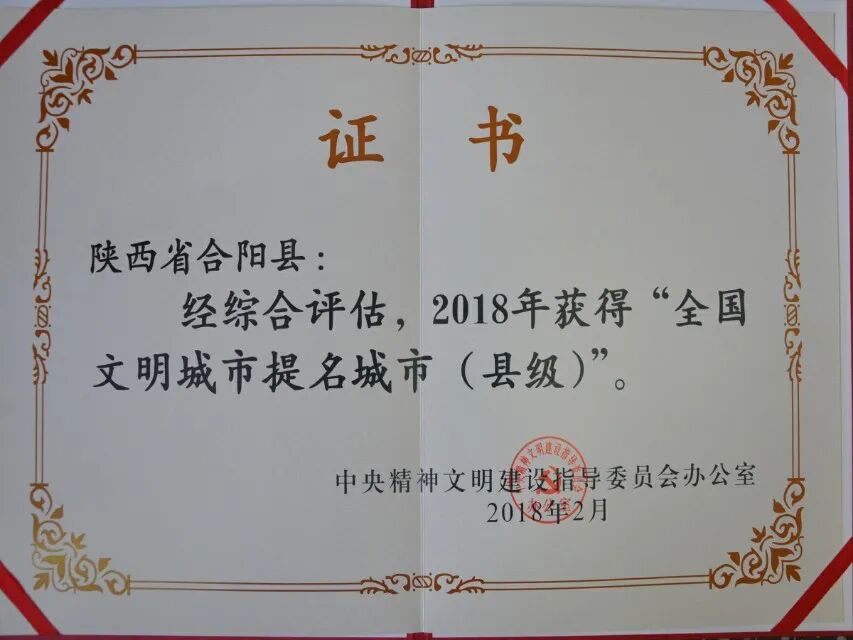 2018年2月,合阳被授予“全国文明城市提名城市”资格。2020年 9月14日,合阳正式入围第六届全国文明城市参评城市。